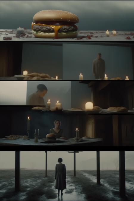 > Director Darren Aronofsky style - burger commercial, shotshot with leica16mm, atmospheric, dark, melancholic, symbolic, provocative, gritty, experimental, introspective, enigmatic, raw emotion, psychological depth, slow-burning, visceral, stark contrasts, moody, naturalistic, intimate, haunting, unconventional, cinematic poetry, rich textures, chiaroscuro, muted colors, earthy tones, high contrast, diffuse lighting, natural light, minimalistic, deep shadows, evocative compositions, symmetrical framing, visual symbolism, fine details, bold silhouettes, artful, cinematic, striking imagery, textured, layered, rule of thirds, moody, elegant, 2020s, sensory overload, studio lighting, global illumination, soft grey light, intricate details, fashion photography, glowing, shimmering, realistic lighting, ambient occlusion, depth of field, unreal engine 5, dlss, rtx, film grain, soft realistic shadows, highly detailed, 8k, ultra-hd, tilt blur, anti-aliasing, octane render, leading lines, realistic materials, surfaces, reflections, accurate modeling, clean geometry, high bounces, motion blur, color grading, retouching, compositing, lens flares, camera shake, motion blur, 300 DPI, 16-bit, 20 megapixels, accurate lighting setup, hdr lighting, high dynamic range, textured mapping, subsurface scattering
