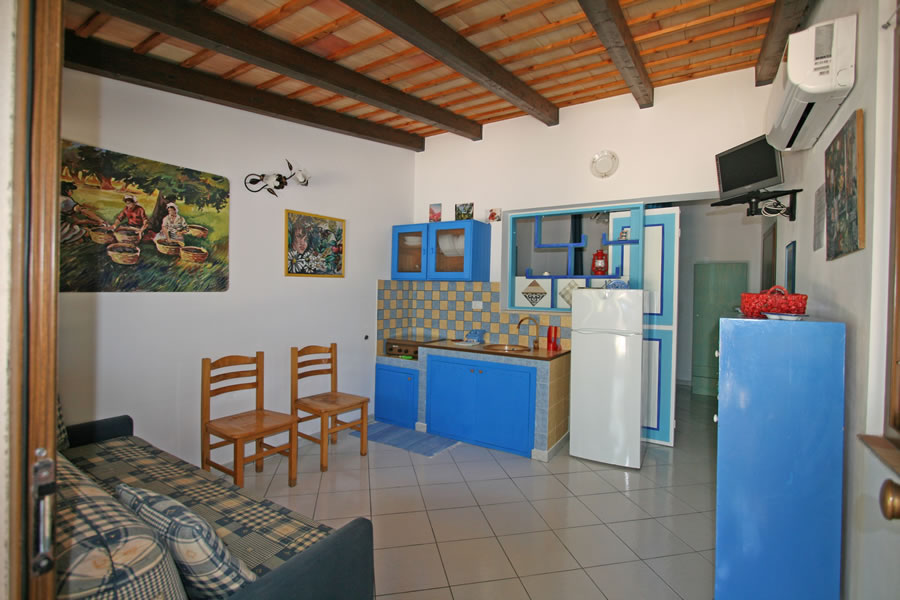 "value": "The image displays an interior space, likely a small kitchen and dining area combined. The ceiling is made of wood, composed of brown beams and lighter wooden panels between them. The walls are painted white, providing a contrast to the bold blue wooden cabinetry and kitchen appliances. The floor is tiled with light grey squares, and a simple wooden dining table with two matching chairs is set to the left. On the table lies a checkered cloth with a pattern of white and a dark color. The kitchen cabinets and fridge are a vivid blue, with the cabinet doors featuring a lighter blue border and yellow tiled patterns above the countertop. The refrigerator stands alone with a red cloth with a pattern of white dots on top, placed to the right side of the kitchen space. On the wall, there are three pieces of art; one is a large landscape painting, another is a smaller portrait, and the third is unidentifiable but appears to be a small sculpture or decorative piece. An air conditioning unit is mounted high on the wall, and a small TV is attached to the upper corner, angled towards the dining area. There are two doors visible; one open, leading to another room with a glimpse of a green door, and the other closed, painted in a deep blue."