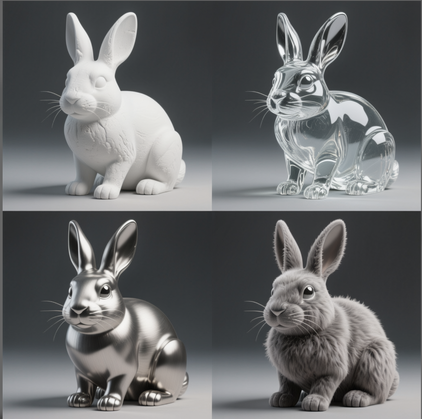![]() Show prompt整体画面采用一个二乘二的四宫格布局,以产品可视化的风格,展示了一只兔子在四种不同材质下的渲染效果。每个宫格内都有一只姿态完全相同的兔子模型,它呈坐姿,双耳竖立,面朝前方。所有宫格的背景均是统一的中性深灰色,这种简约背景旨在最大限度地突出每种材质的独特质感。左上角的宫格中,兔子模型由哑光白色石膏材质构成。其表面平滑、均匀且无反射,在模型的耳朵根部、四肢交接处等凹陷区域呈现出柔和的环境光遮蔽阴影,这种微妙的阴影变化凸显了其纯粹的几何形态,整体感觉像一个用于美术研究的基础模型。 右上角的宫格中,兔子模型由晶莹剔透的无瑕疵玻璃制成。它展现了逼真的物理折射效果,透过其透明的身体看到的背景呈现出轻微的扭曲。清晰的镜面高光沿着其身体的曲线轮廓流动,表面上还能看到微弱而清晰的环境反射,赋予其一种精致而易碎的质感。 左下角的宫格中,兔子模型呈现为带有拉丝纹理的钛金属材质。金属表面具有明显的各向异性反射效果,呈现出冷峻的灰调金属光泽。锐利明亮的高光和深邃的阴影形成了强烈对比,精确地定义了其坚固的三维形态,展现了工业设计般的美感。 右下角的宫格中,兔子模型覆盖着一层柔软浓密的灰色毛绒。根根分明的绒毛清晰可见,创造出一种温暖、可触摸的质地。光线照射在绒毛的末梢,形成柔和的光晕效果,而毛绒内部的阴影则显得深邃而柔软,展现了高度写实的毛发渲染效果。 整个四宫格由来自多个方向的、柔和均匀的影棚灯光照亮,确保了每种材质的细节和特性都得到清晰的展现,没有任何刺眼的阴影或过曝的高光。这张图像以一种高度写实的3D渲染风格呈现,完美地诠释了产品可视化的精髓 |