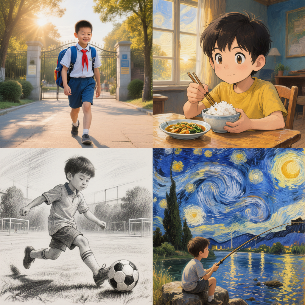 ![]() Show prompt由一个两行两列的网格构成,共包含四个独立的场景,每个场景都以不同的艺术风格描绘了一个小男孩(小明)一天中的不同活动。左上角的第一个场景,以超写实摄影风格呈现。画面主体是一个大约8岁的东亚小男孩,他穿着整洁的小学制服——一件白色短袖衬衫和蓝色短裤,脖子上系着红领巾。他背着一个蓝色的双肩书包,正走在去上学的路上。他位于画面的前景偏右侧,面带微笑,步伐轻快。场景设定在清晨,柔和的阳光从左上方照射下来,在人行道上投下清晰而柔和的影子。背景是绿树成荫的街道和模糊可见的学校铁艺大门,营造出宁静的早晨氛围。这张图片的细节表现极为丰富,可以清晰地看到男孩头发的光泽、衣服的褶皱纹理以及书包的帆布材质,完全展现了专业摄影的质感。 右上角的第二个场景,采用日式赛璐璐动漫风格绘制。画面中,小男孩坐在家中的木质餐桌旁吃午饭。他的形象被动漫化,拥有大而明亮的眼睛和简洁的五官线条。他身穿一件简单的黄色T恤,正用筷子夹起碗里的米饭。桌上摆放着一碗汤和两盘家常菜。背景是一个温馨的室内环境,一扇明亮的窗户透进正午的阳光,窗外是蓝天白云。整个画面色彩鲜艳、饱和度高,角色轮廓线清晰明确,阴影部分采用平涂的色块处理,是典型的赛璐璐动漫风格。 左下角的第三个场景,以细腻的铅笔素描风格呈现。画面描绘了下午在操场上踢足球的小男孩。整个图像由不同灰度的石墨色调构成,没有其他颜色。小男孩身穿运动短袖和短裤,身体呈前倾姿态,右脚正要踢向一个足球,动作充满动感。背景是空旷的操场和远处的球门,用简练的线条和排线勾勒。艺术家通过交叉排线和涂抹技巧来表现光影和体积感,足球上的阴影、人物身上的肌肉线条以及地面粗糙的质感都通过铅笔的笔触得到了充分的展现。这张铅笔画突出了素描的光影关系和线条美感。 右下角的第四个场景,以文森特·梵高的后印象派油画风格进行诠释。画面描绘了夜晚时分,小男孩独自在河边钓鱼的景象。他坐在一块岩石上,手持一根简易的钓鱼竿,身影在深蓝色的夜幕下显得很渺小。整个画面的视觉焦点是天空和水面,天空布满了旋转、卷曲的星云,星星和月亮被描绘成巨大、发光的光团,使用了厚涂的油画颜料(Impasto),笔触粗犷而充满能量。深蓝、亮黄和白色的颜料在画布上相互交织,形成强烈的视觉冲击力。水面倒映着天空中扭曲的光影,整个场景充满了梵高作品中特有的强烈情感和动荡不安的美感。这幅画作是对梵高风格的深度致敬。 |